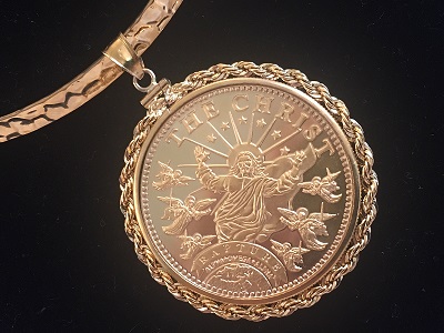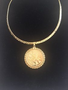 The 14k Gold and Sterling Silver Bezels to encase the coins, to go with a chain or bangle to create a neckless, can also be purchased separately.